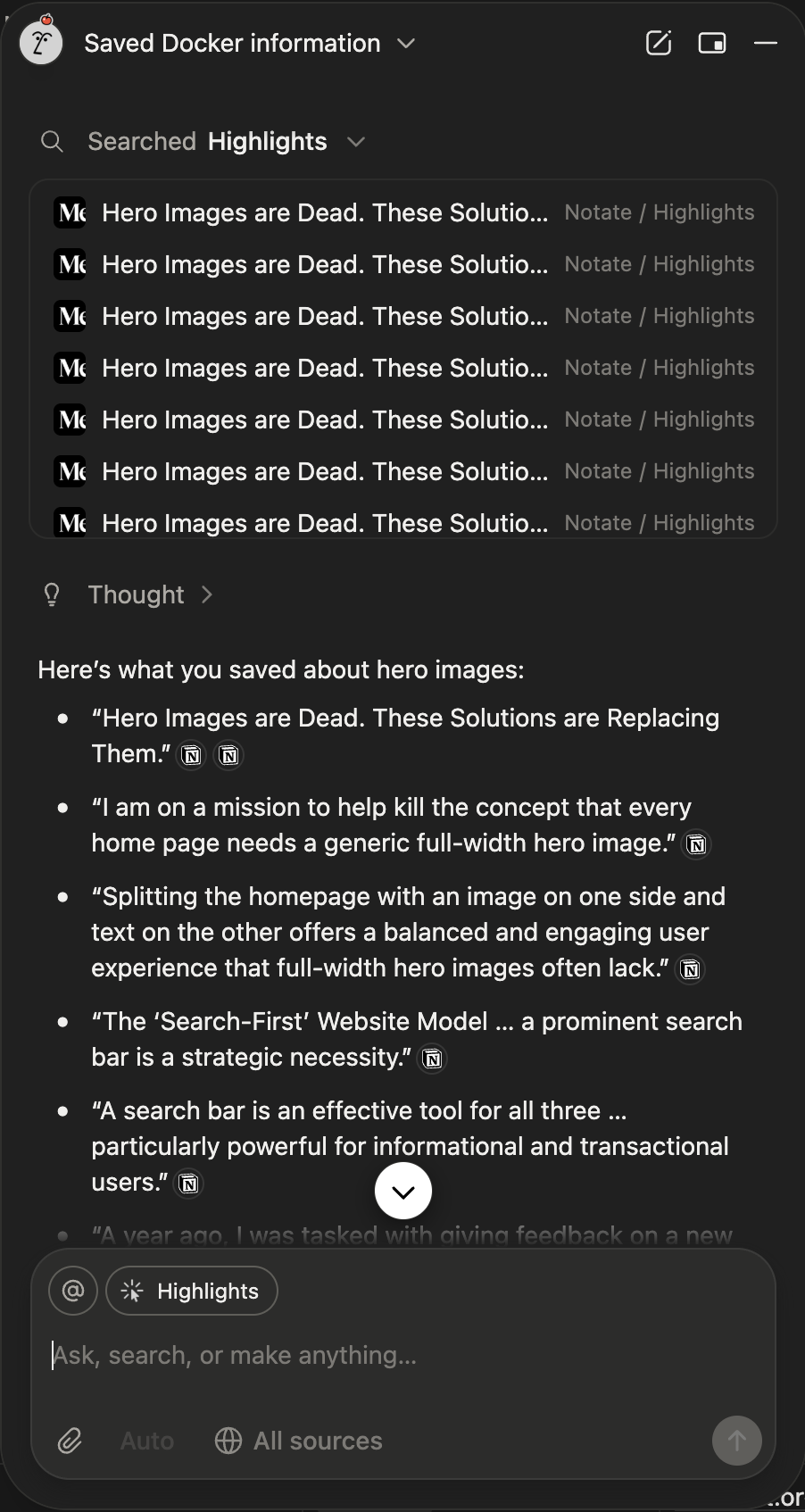 Don't get me wrong, getting the entire web page sounds good on paper. It is flashy, too. But it simply doesn't work. 1) it is not scalable; 2) it introduces too much fluff (makes the LLM, in this case Notion AI's in-context-learning way too disbalanced); 3) is no different than prompting ChatGPT.